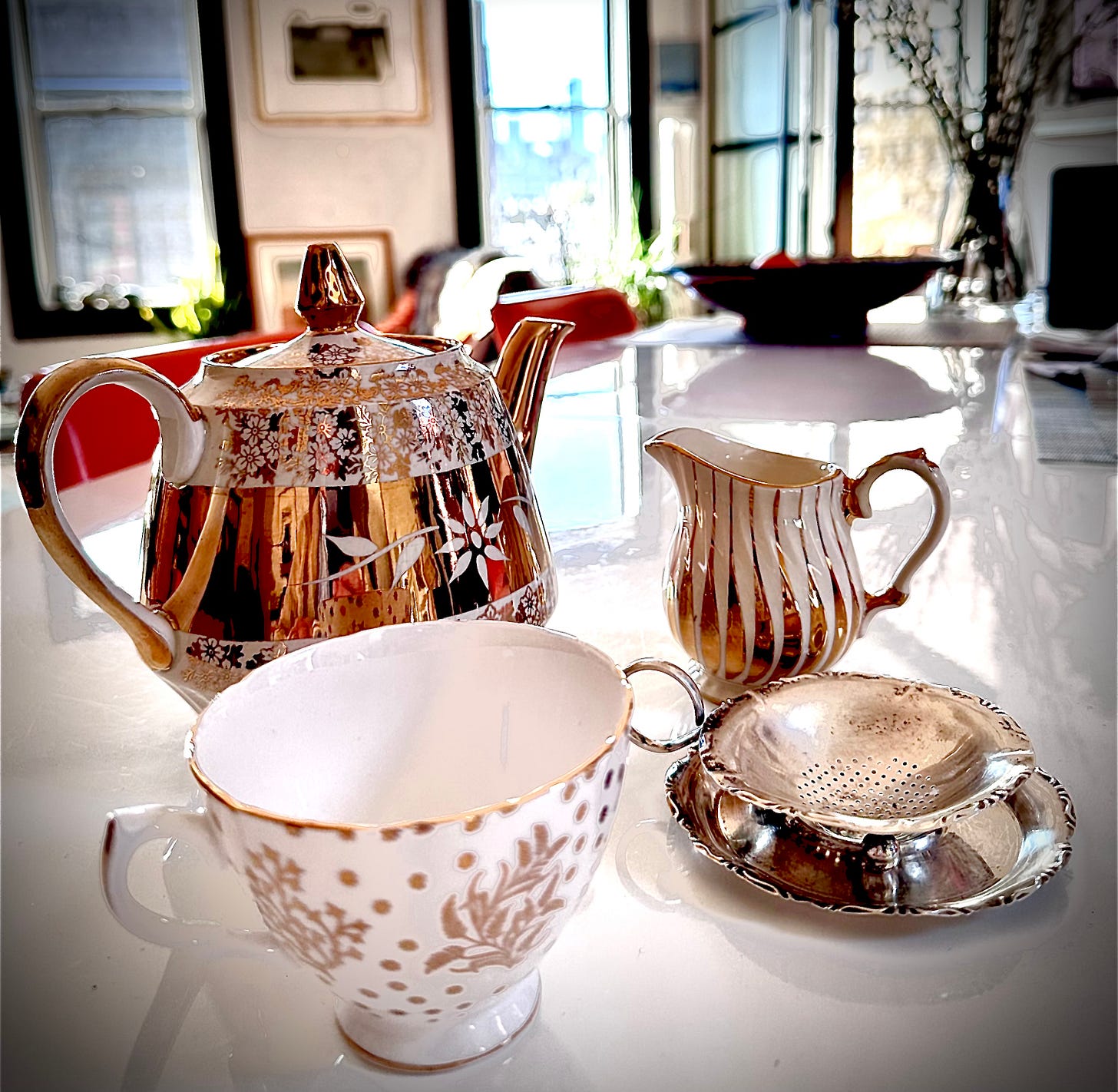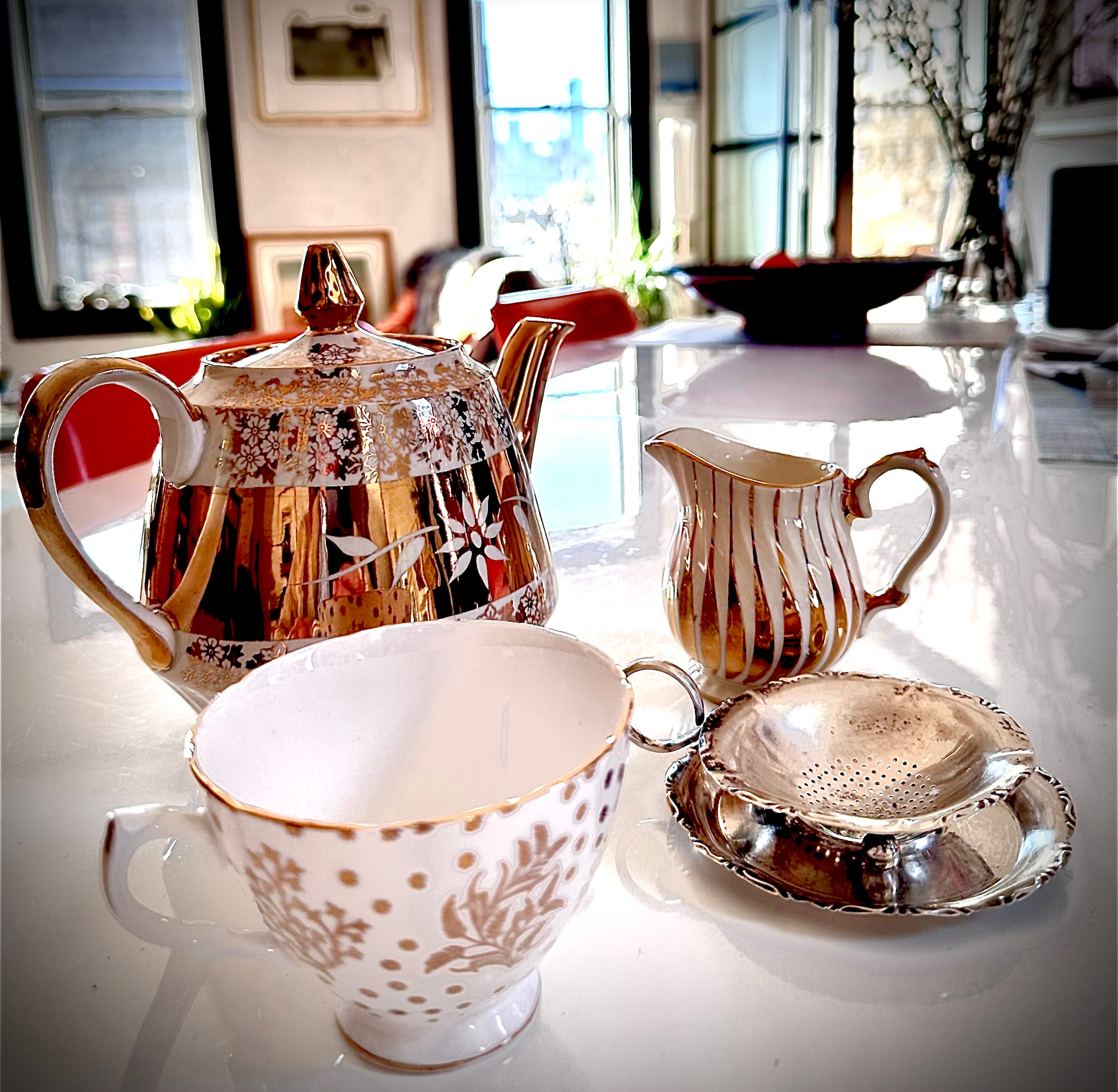 I know what I like. Most mornings begin with Darjeeling. A hint of green still on the long, curled black leaf, which gives it a fresh, quenchable flavour. Just a pinch between the thumb and forefinger, no more. Enough to turn the boiling water to the palest hint of honey. Gnat’s pee, we used to call it. Always loose leaves. Teabags have no place except in emergency or when Builder’s Tea is required. But this does not fit the bill here. My mornings require a deluge of tea. Which means a teapot, capacious and extravagantly decorated.